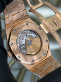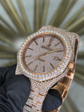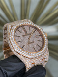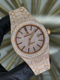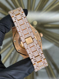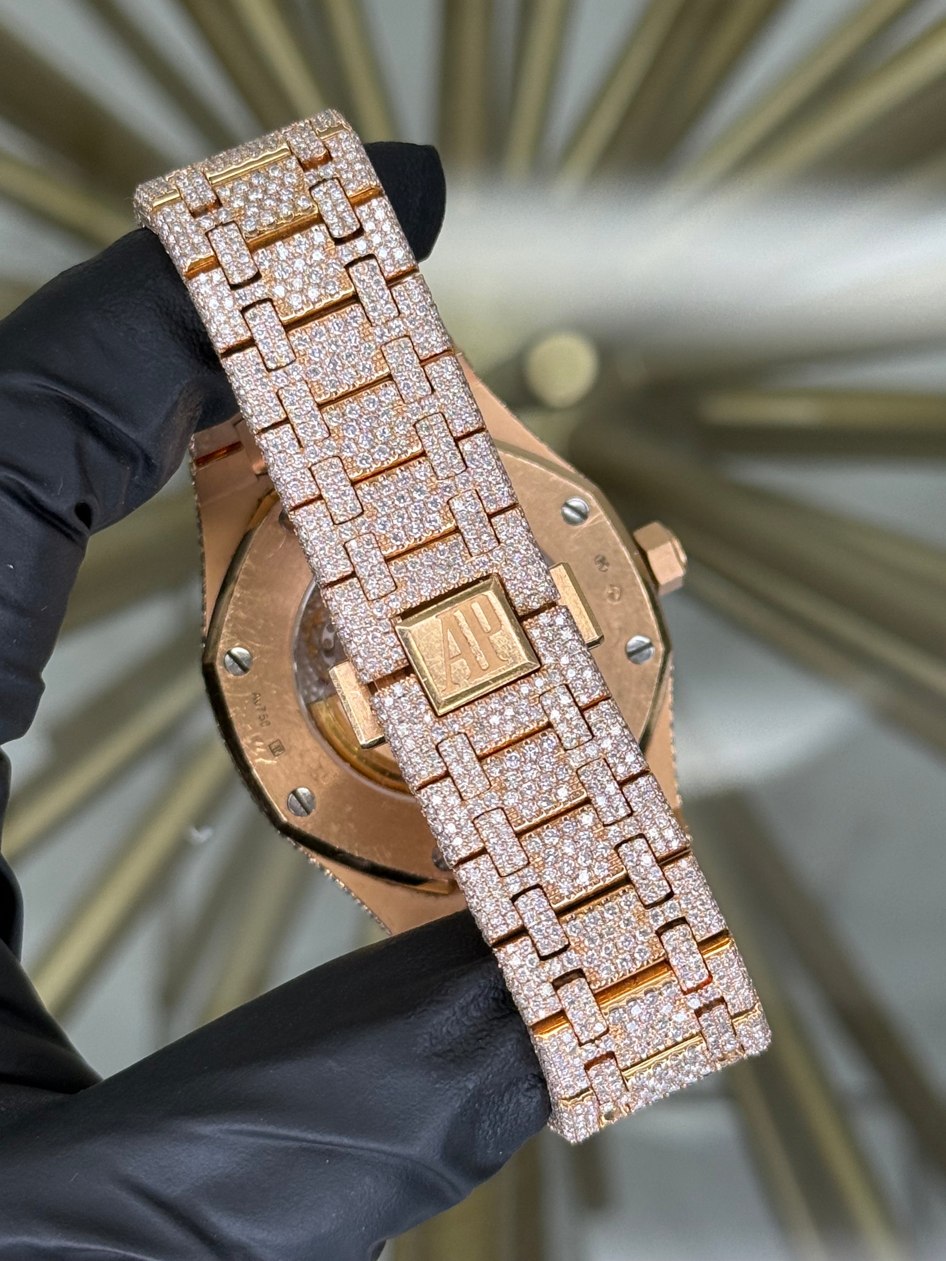 This Audemars Piguet Royal Oak, reference number 15400OR (Machine), exemplifies luxury and craftsmanship. Encased in rose gold, it features a custom iceout dial and diamond bezel, offering an opulent aesthetic. The 41mm case size provides a bold presence on the wrist, accentuated by a custom iceout bracelet that enhances its lavish design.