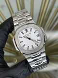 The Patek Philippe Nautilus, reference number 5711/1A-011, is a distinguished timepiece that showcases the brand's exceptional craftsmanship. Featuring a sleek white dial and a stainless steel composition, this watch is a representation of elegance and durability. The fixed bezel and stainless steel bracelet add to the watch's sophisticated appeal, while its 40mm case size ensures a comfortable fit for any wrist. The Patek Philippe Nautilus is perfect for individuals who value both luxury and functionality.