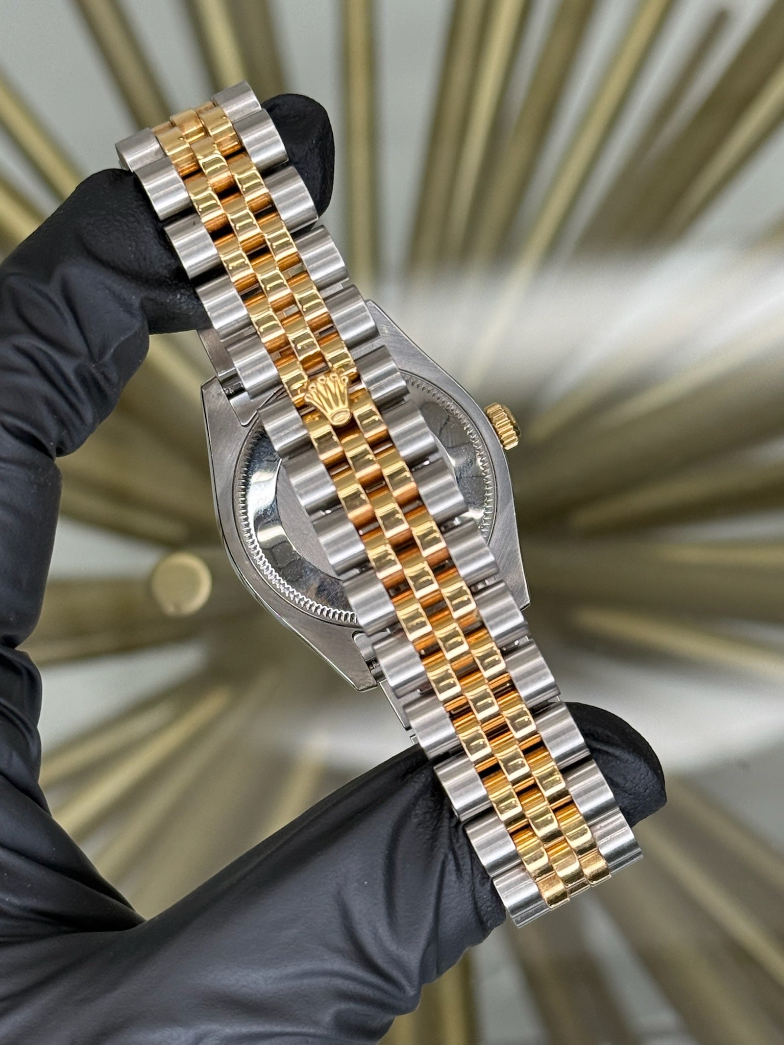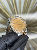 This exquisite Rolex Datejust 31, reference number 178313, is a stunning timepiece that exemplifies luxury and precision. Crafted from yellow gold and stainless steel, it features a breathtaking champagne mother of pearl diamond dial and a 12 diamond bezel that shines with elegance. The Jubilee bracelet enhances its sophisticated appearance, making it perfect for those who appreciate timeless style. With a case size of 31mm, this watch combines classic design with modern elements.