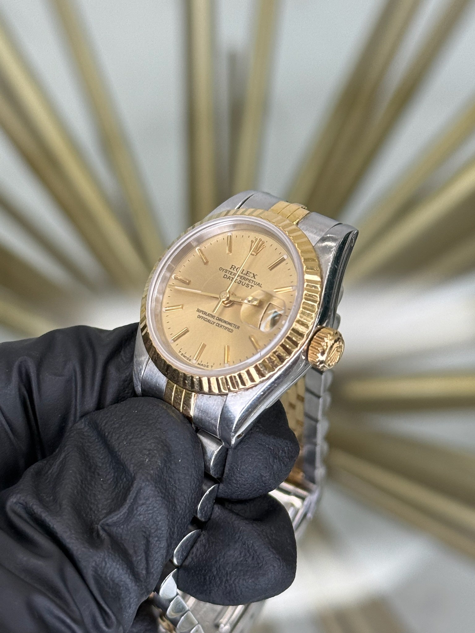 Discover the elegance of the Rolex Datejust, reference number 69173, a classic timepiece that blends luxury with timeless design. Crafted from a harmonious combination of stainless steel and yellow gold, this watch features a champagne stick dial and a signature fluted bezel. The Jubilee bracelet adds to its refined aesthetic, making it a versatile choice for any occasion. The 26mm size ensures it fits comfortably on the wrist while embodying the perfect balance of form and function.