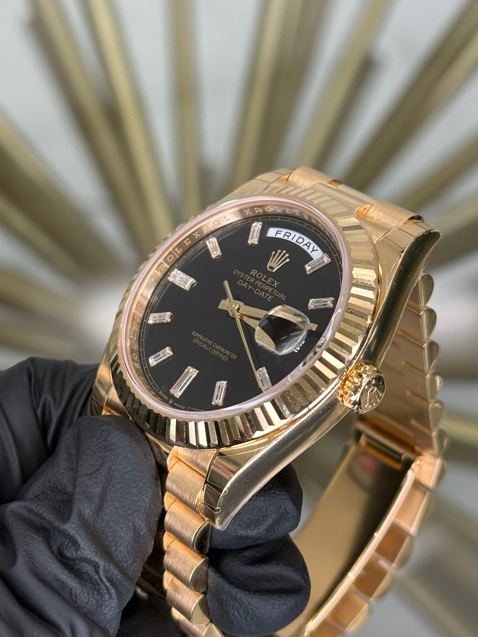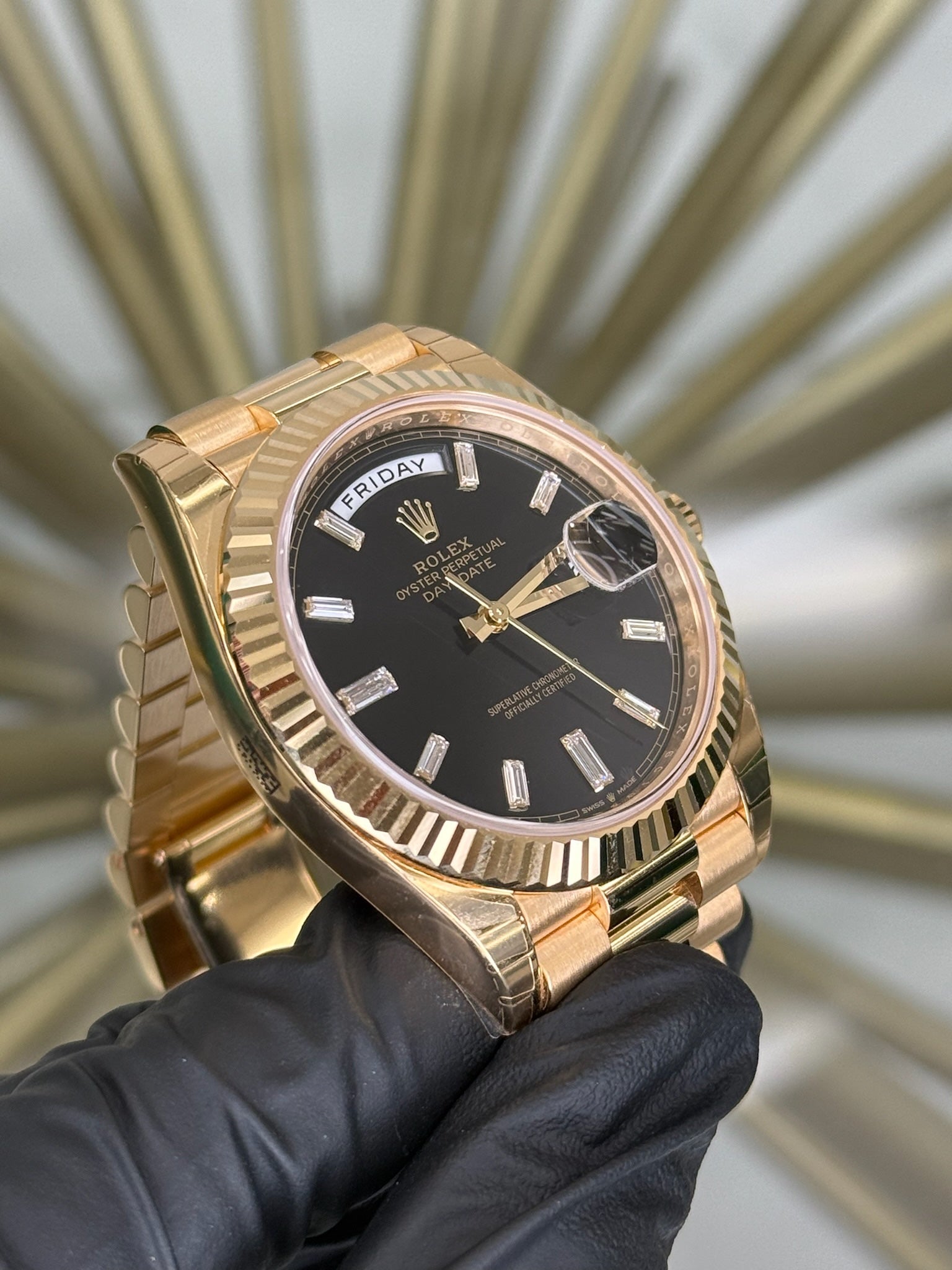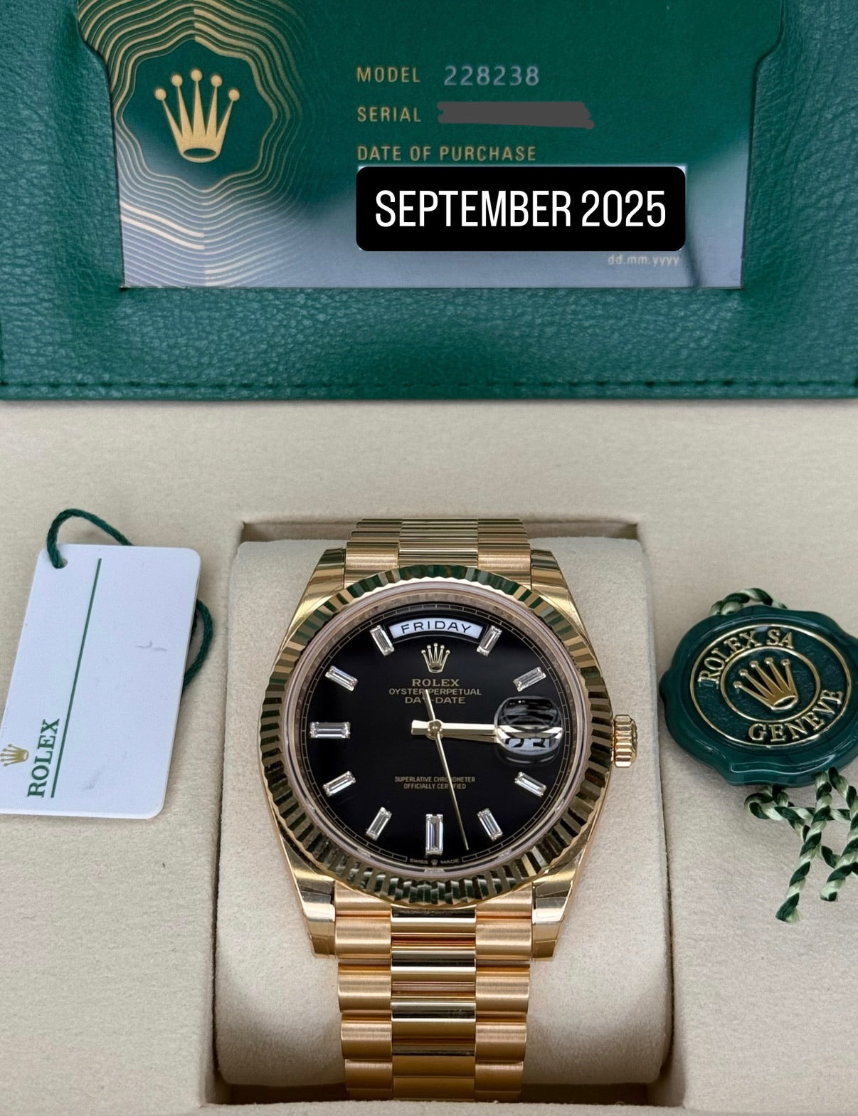 Rolex Day-Date 40 Black Baguette Diamond Dial on President 228238 2025 Complete