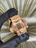 This impressive Rolex Daytona, reference number 116515LN, showcases the perfect blend of luxury and performance with its rich Chocolate Arabic dial and sophisticated fixed bezel. Housed in a 40mm rose gold case, it is paired with a durable Oysterflex bracelet, complementing its sporty yet elegant design. This timepiece is a remarkable example of Rolex's horological excellence.