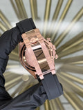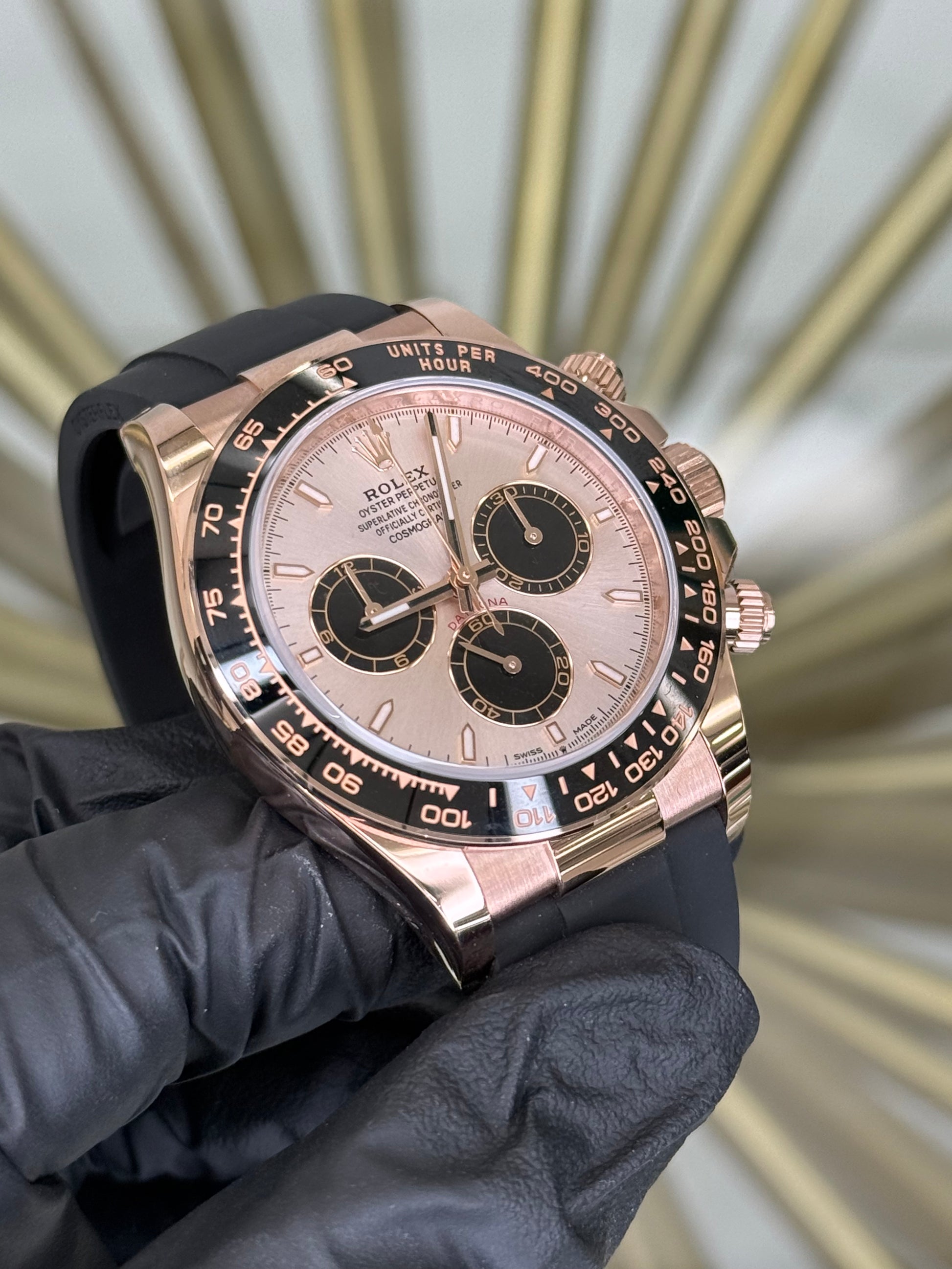 The Rolex Daytona, reference number 126515LN, is a prestigious timepiece crafted in Everose Gold, offering a perfect blend of luxury and performance. Its striking Sundust and Black Index dial paired with a fixed bezel and the sophisticated Oysterflex bracelet make it a standout choice for those seeking elegance and functionality. The 40mm case encapsulates the essence of Rolex craftsmanship, proudly representing the Daytona series renowned for its timeless appeal.