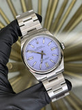 Introducing the Rolex Oyster Perpetual 41, reference number 134300, a classic and elegant timepiece that exemplifies the essence of watchmaking craftsmanship. This model features a striking lavender dial, smooth bezel, and is crafted from durable stainless steel. The 41mm case is complemented by the iconic Oyster bracelet, offering both comfort and style, making it a sophisticated choice for any occasion.