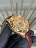 The Rolex Sky-Dweller, reference number 326138, is an exceptional timepiece designed for discerning travelers. Featuring a distinctive champagne Arabic dial that enhances its luxurious appearance, this watch boasts a fluted bezel and a sophisticated leather bracelet. With a substantial size of 42mm and crafted in elegant yellow gold, the Rolex Sky-Dweller is both a functional travel companion and a statement of ultimate prestige and refinement.